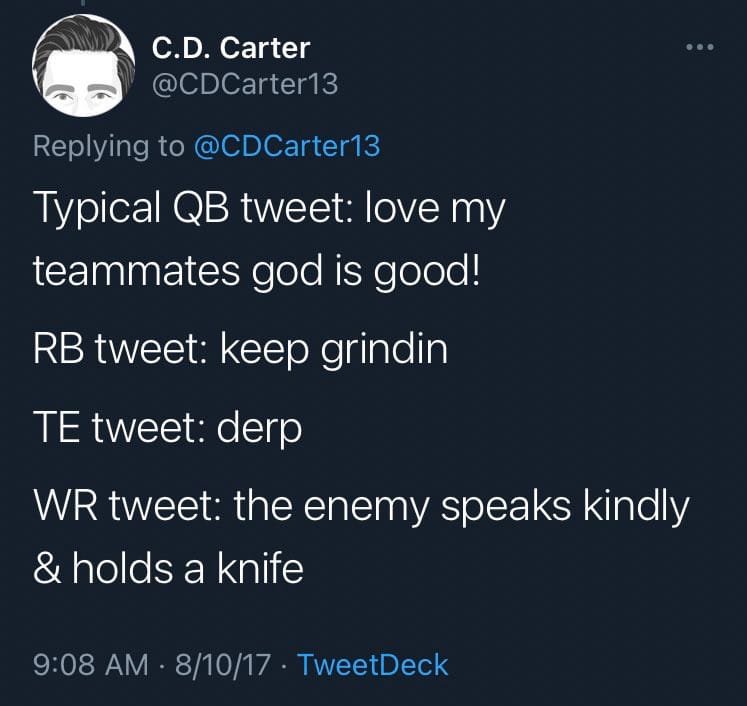 Jayden Higgins, in the second round, has that dog in him—but he also has that diva. He is the exact type of wide receiver that Denny Carter was alluding to with his mega-viral "the enemy speaks kindly and holds a knife" post.