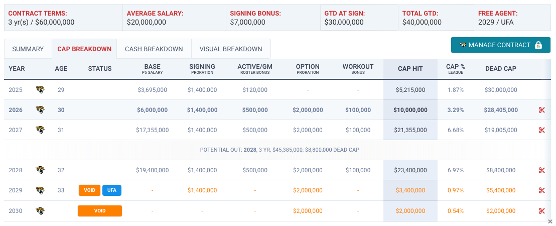 | Year | Age | Cap Hit | Dead Cap | (+/-) If Cut |