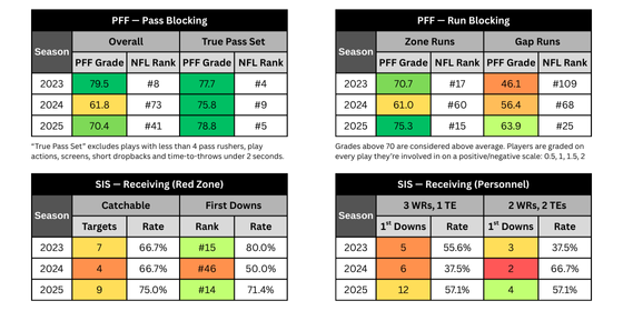 Thomas was rumored to be available at the 2025 trade deadline, but he fills a key role on the Jaguars offense and still has two years remaining on a cost-controlled rookie deal (plus a 5th-year option). BTJ has seen boundary shots at roughly double the rate of any wideout currently on the Jags roster.