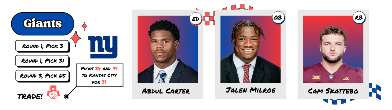 Then, the Giants address the QB position by trading back into the first round with Kansas City to take Jalen Milroe, finally giving him his moment in the spotlight as he's one of two prospects remaining in the green room on Thursday night.