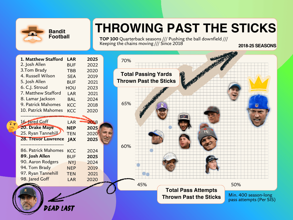 Out of 178 quarterbacks, Stafford's 2025 season ranked in the Top 5 of the following rate stats when throwing past the sticks: