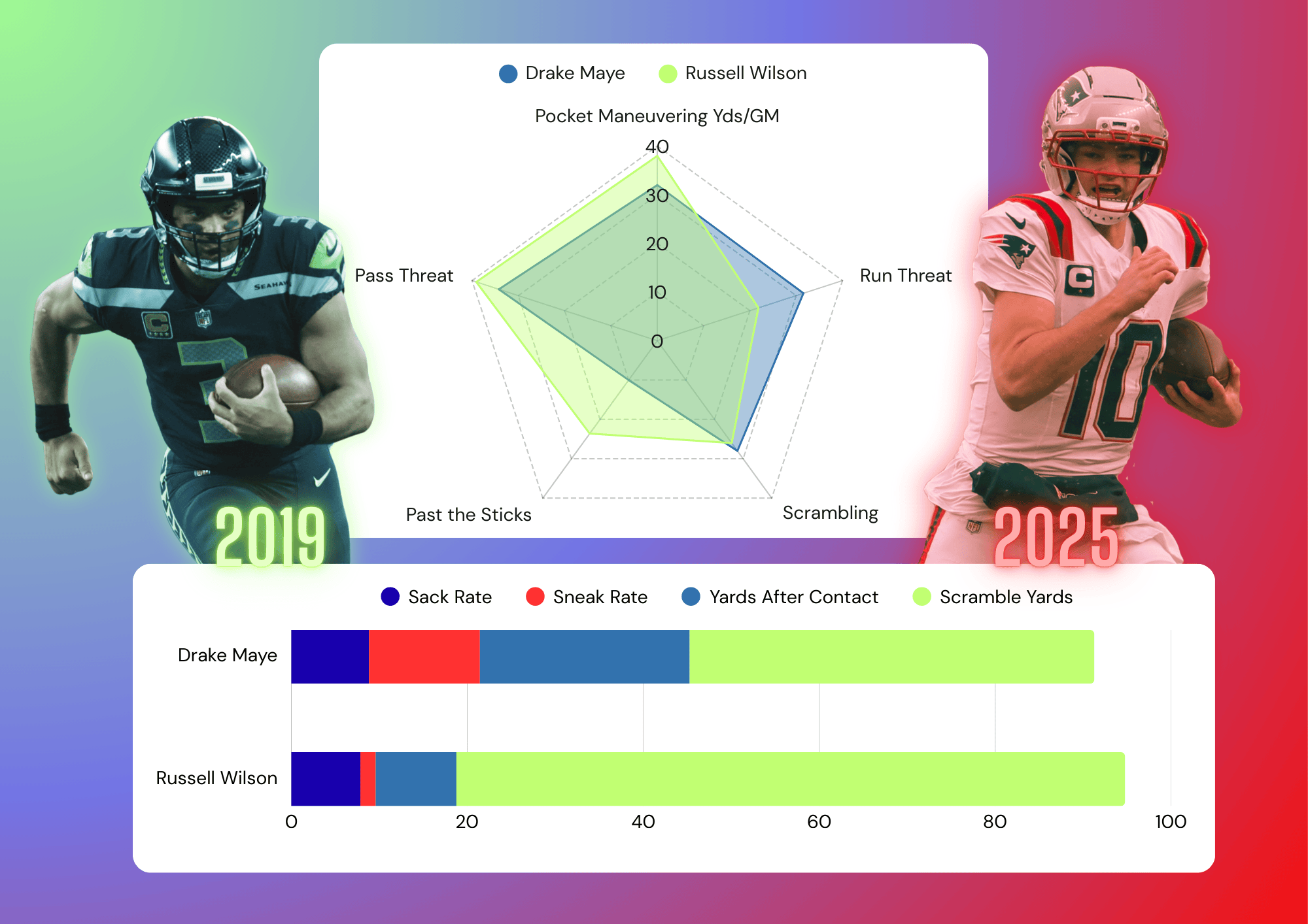 Drake Maye's 2025 season compares favorably to Russell Wilson's 2019 campaign. Both used their legs at a high rate to extend plays and dictate the tempo of games: