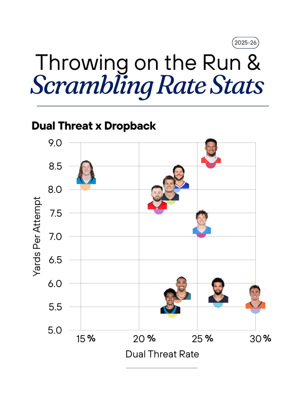 - Dual Threat Rate: Scrambles + Throws on the run divided by / All Dropbacks, including the playoffs (calculated through the Divisional Round)
